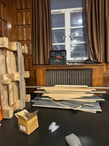 We were aiming to meet the Baseline target from the Theatre Green Book – which requires 50% of the materials used in your production to be from reused or recycled materials. Being able to reuse the panto floor like this is key to reducing the amount of virgin materials that go into making a set. We also reused wood from another production that our designer had recently worked on. This is great evidence that having these early conversations means that the creatives always have environmental action in their minds when thinking about realising their design.